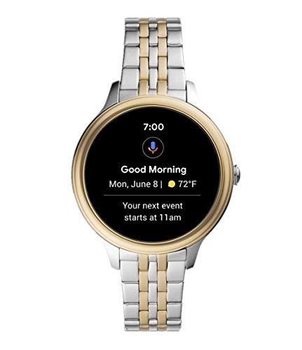 Technologie voor elke dag. Deze touchscreen-smartwatch Gen 5E met 42 mm behuizing en tweekleurige roestvrijstalen band heeft een luidsprekerfunctie, 4 GB opslagcapaciteit en drie intelligente batterijmodi om de levensduur van de batterij met meerdere dagen te verlengen. Smartwatches met WearOS by Google zijn compatibel met iPhone- en Android-smartphones. WearOS by Google en andere bijbehorende merken zijn handelsmerken van GoogleLLC. Ondersteunde functies kunnen variëren afhankelijk van het platform.