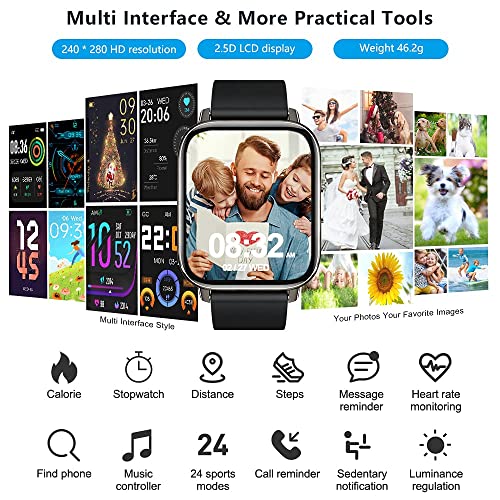 1.69 “HD-aanraakscherm en aangepaste stijl: dit Android-smartwatch gebruikt een 1,69-inch vierkant kleurenaanraakscherm en heeft een resolutie van 240 * 280 HD, een sterk en duurzaam 2,5D LCD-scherm, instelbare helderheid op 4 niveaus, voor een betere visuele ervaring. De smartwatch-fitnesstracker heeft 100 wijzerplaten om uit te kiezen en ondersteunt ook het kiezen van alle gewenste foto’s op je telefoon als achtergrond.
